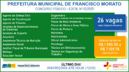 A Prefeitura Municipal de Francisco Morato, Estado de São Paulo, está com inscrições abertas para o seu Concurso Público que visa o preenchimento de Cadastro Reserva para Guarda Civil Municipal. Com salário de R$ 2.386,61…