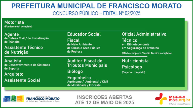 As inscrições poderão ser realizadas até 12 de maio de 2025 somente no site do Instituto Mais (www.institutomais.org.br), empresa organizadora do certame.