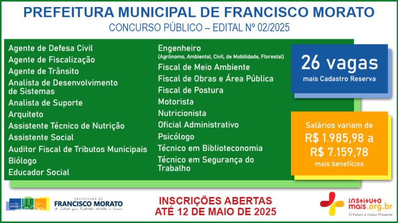 A Prefeitura Municipal de Francisco Morato, Estado de São Paulo, está com o período de inscrição aberto para o seu Concurso Público que visa o preenchimento de 26 vagas mais Cadastro Reserva em todos os níveis de escolaridade.